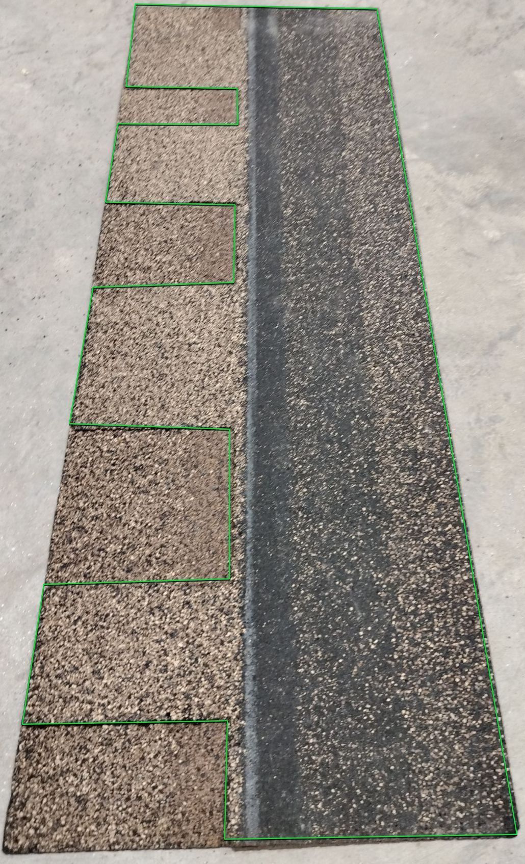An architectural shingle isn’t just one piece—it’s actually two pieces laminated together. The top portion includes the “dragon’s teeth” (those cutout shapes you see from the ground), plus an unseen upper section. This forms most of the visible shingle.